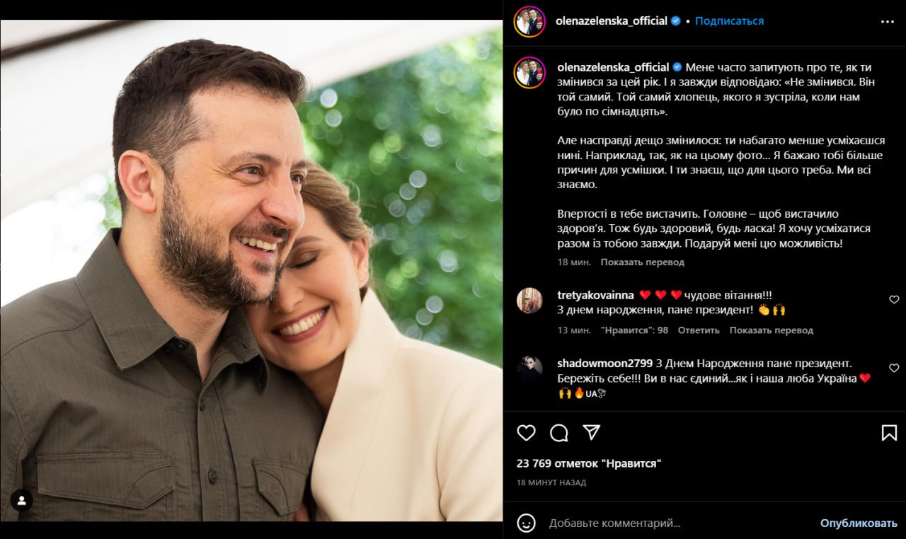 Сегодня, 25 января, президент Украины Владимир Зеленский отмечает 45-летие. Первая леди Украины поздравила мужа и рассказала, как он изменился за этот год.
