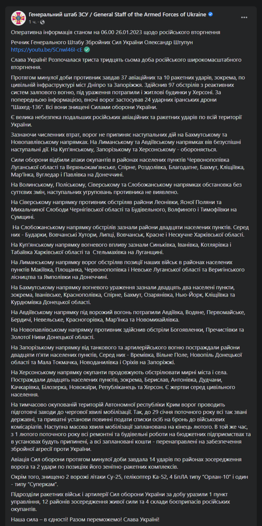 В четверг, 26 января, в Украине идет уже 337-й день войны с РФ.