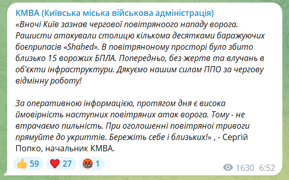 08:27 Глава Офиса президента Ермак сообщает о первых сбитых ракетах противника.