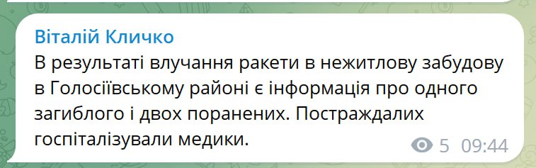 В Киевской городской военной администрации уточнили, что 55-летний мужчина в Голосеевском районе погиб, по предварительной информации, в результате падения части ракеты.