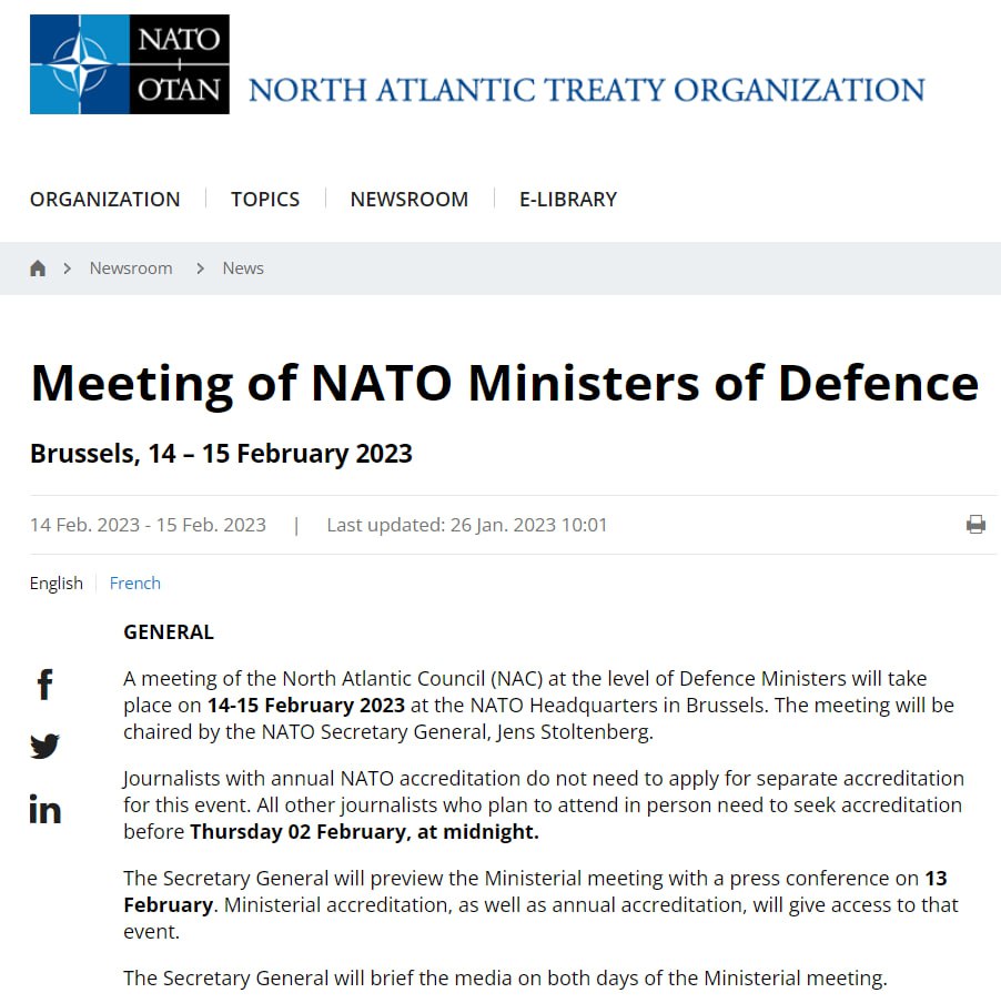 14-15 февраля пройдет заседание Североатлантического совета на уровне министров обороны стран НАТО в штаб-квартире НАТО в Брюсселе.