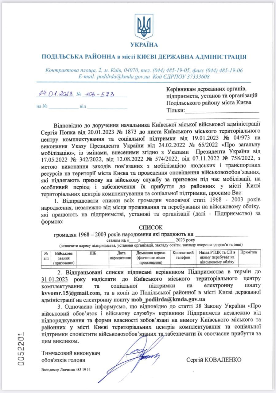 Этим документом админиистрация просит предприятия предоставить данные всех мобилизованных до 31 января.