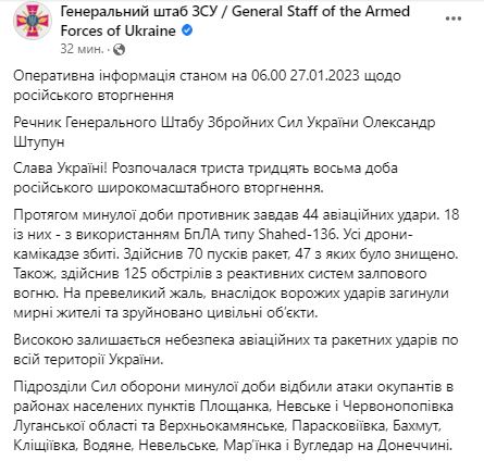 07.13 Утром 27 января Генштаб обнародовал сводку о ситуации на фронте.