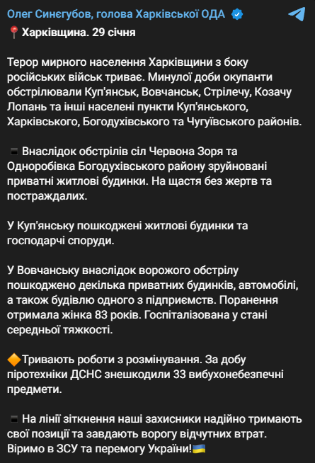"В результате обстрелов сел Красная Заря и Одноробовка Богодуховского района разрушены частные жилые дома. К счастью, без жертв и пострадавших. В Купянске повреждены жилые дома и хозяйственные постройки.