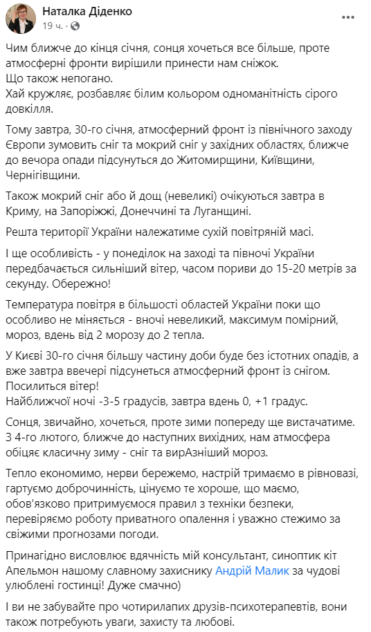 В Киеве 30 января большая часть суток будет без существенных осадков. Однако завтра вечером в столицу придет атмосферный фронт со снегом. Также усилится ветер.
