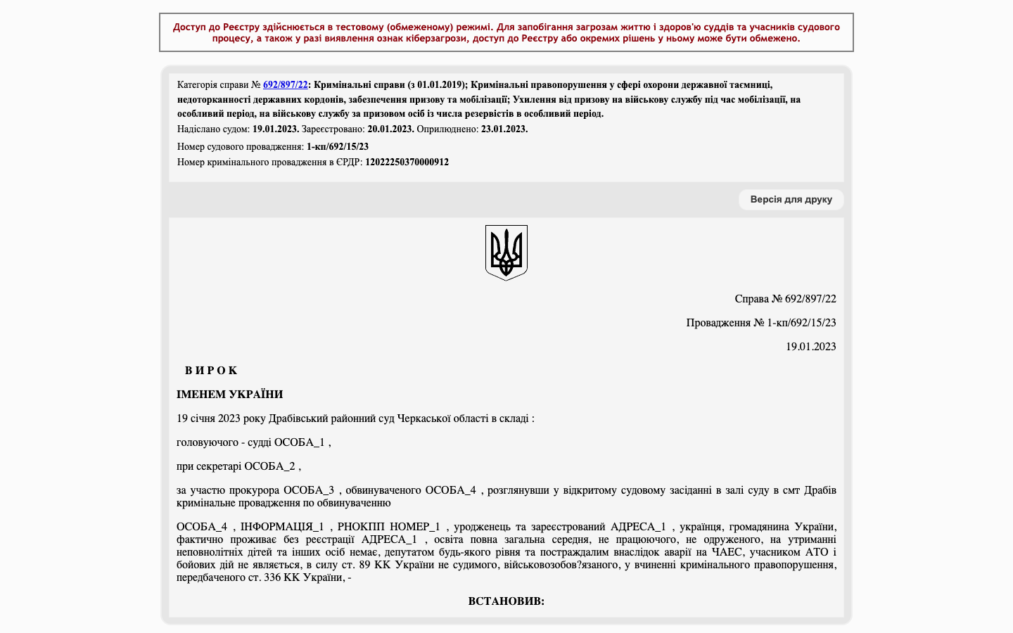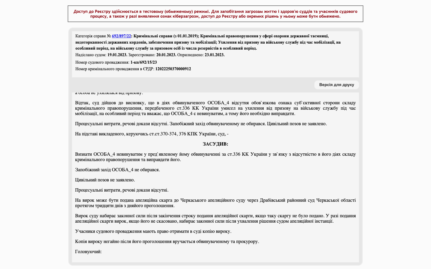 Украинские суды выносят по статье об уклонении от мобилизации не только обвинительные, но и оправдательные приговоры. Так, в Черкасской области суд оправдал мужчину, который не прибыл в военкомат по звонку.