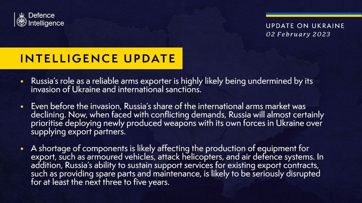 Также разведка Британии прогнозирует, что способность России оказывать услуги поддержки существующих экспортных контрактов, такие как поставка запасных частей и техническое обслуживание, вероятно, будет серьезно подорвана, по крайней мере, в течение следующих трех-пяти лет.