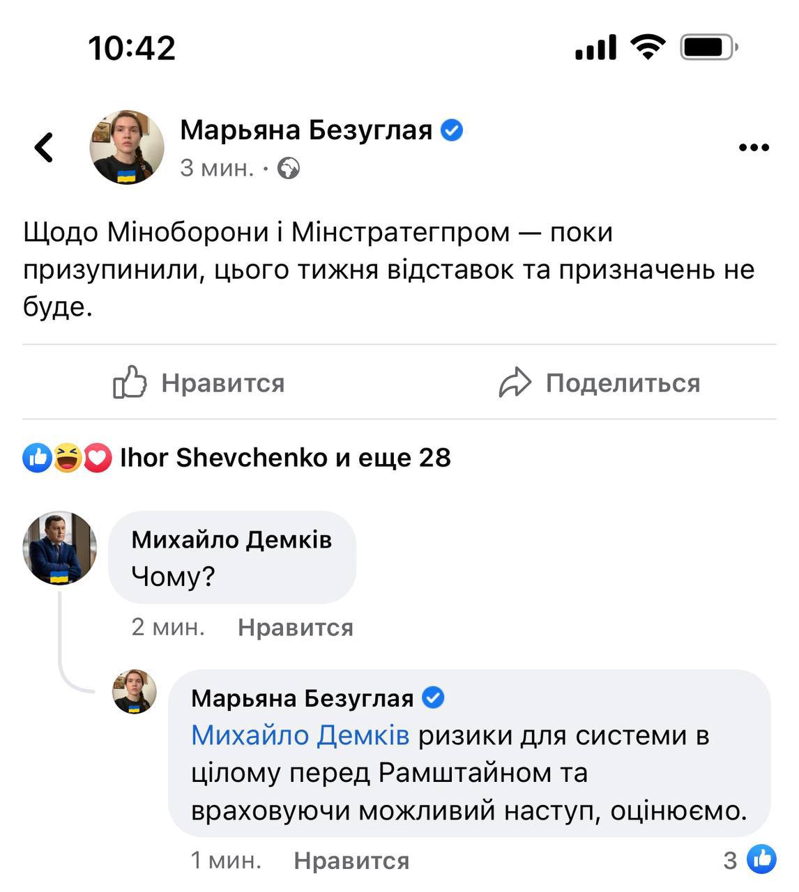 Депутат фракции "Слуга народа" Марьяна Безуглая у себя на странице в Facebook сообщила, почему приостановили решение по отставке министра обороны.