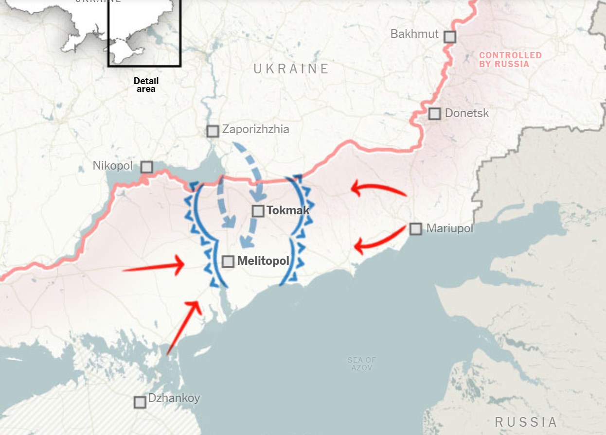 В общем, как уже мы писали, ключевой вопрос всей войны - сможет ли украинская армия перерезать сухопутный коридор в Крым и выйти на границу с полуостровом к Перекопу.