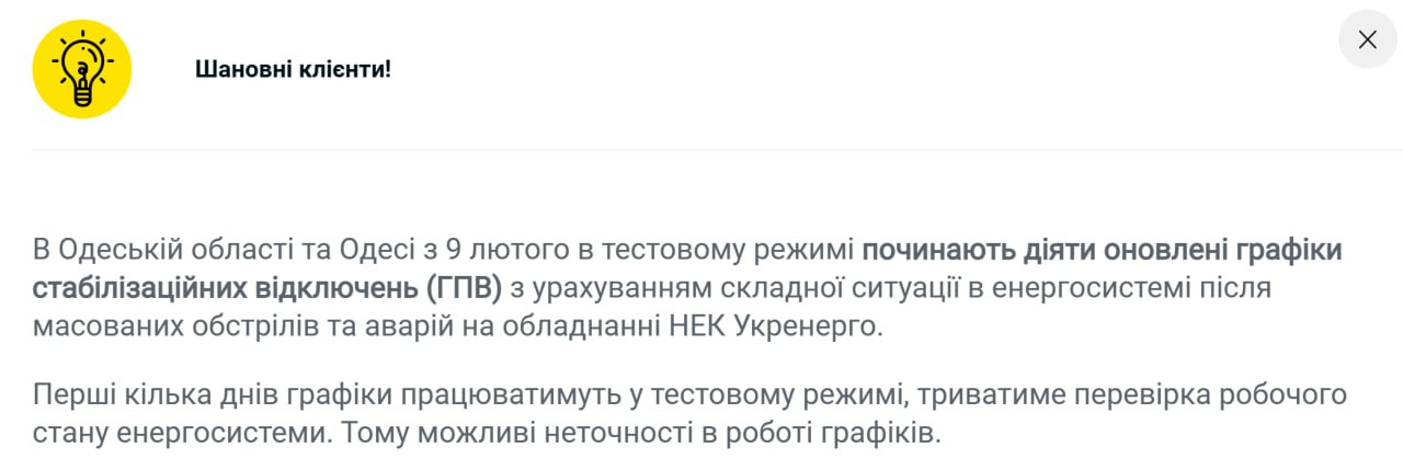 То же самое обещали насчет Одессы, но пока на сайте ДТЭК для города указаны стабилизационные отключения.