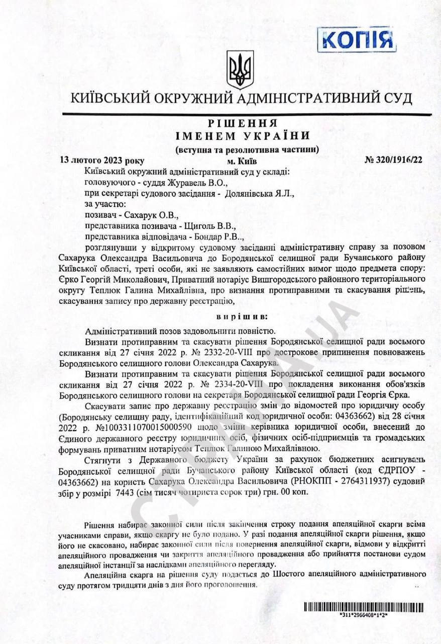 Сегодня, 13 февраля, административный суд Киева признал противоправным два решения сессии Бородянского поселкового совета от 27 января 2022 года и восстановил в должности отстраненно мэра Бородянки Александра Сахарука.