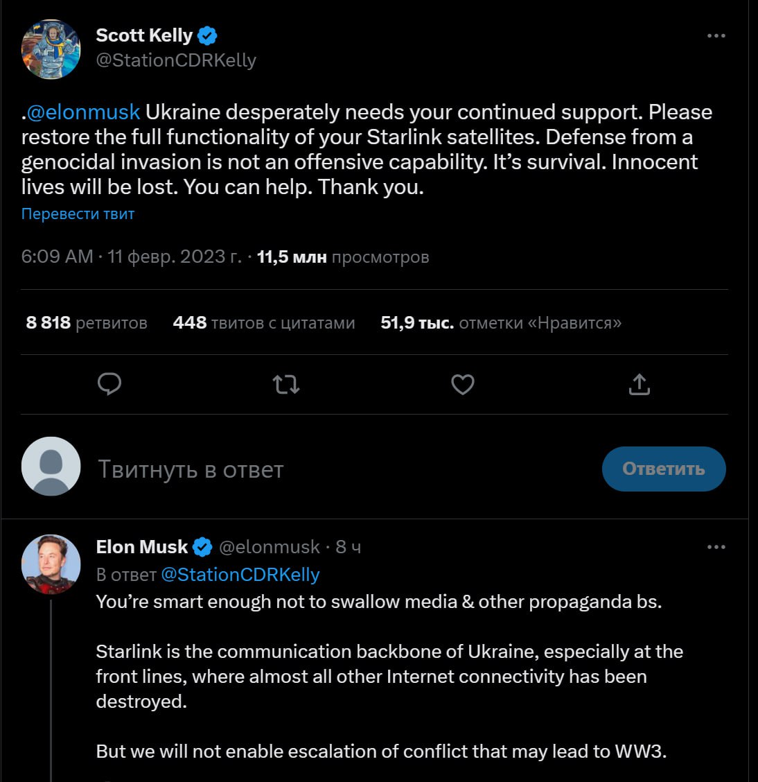 Келли написал твит, где призвал "восстановить полную функциональность спутников Starlink".