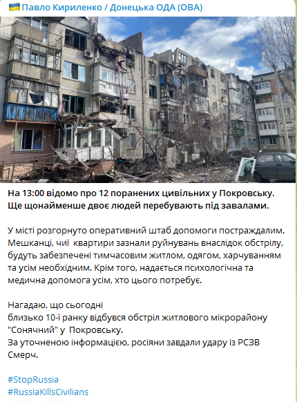 В Покровске, где под удар попала жилая многоэтажка, к 13:00 известно о 12 раненых. Еще по меньшей мере два человека находятся под завалами.