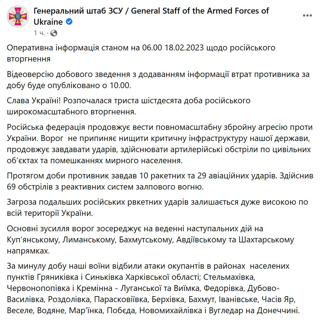Генштаб ВСУ опубликовал оперативную сводку с фронта по состоянию на утро 18 февраля.