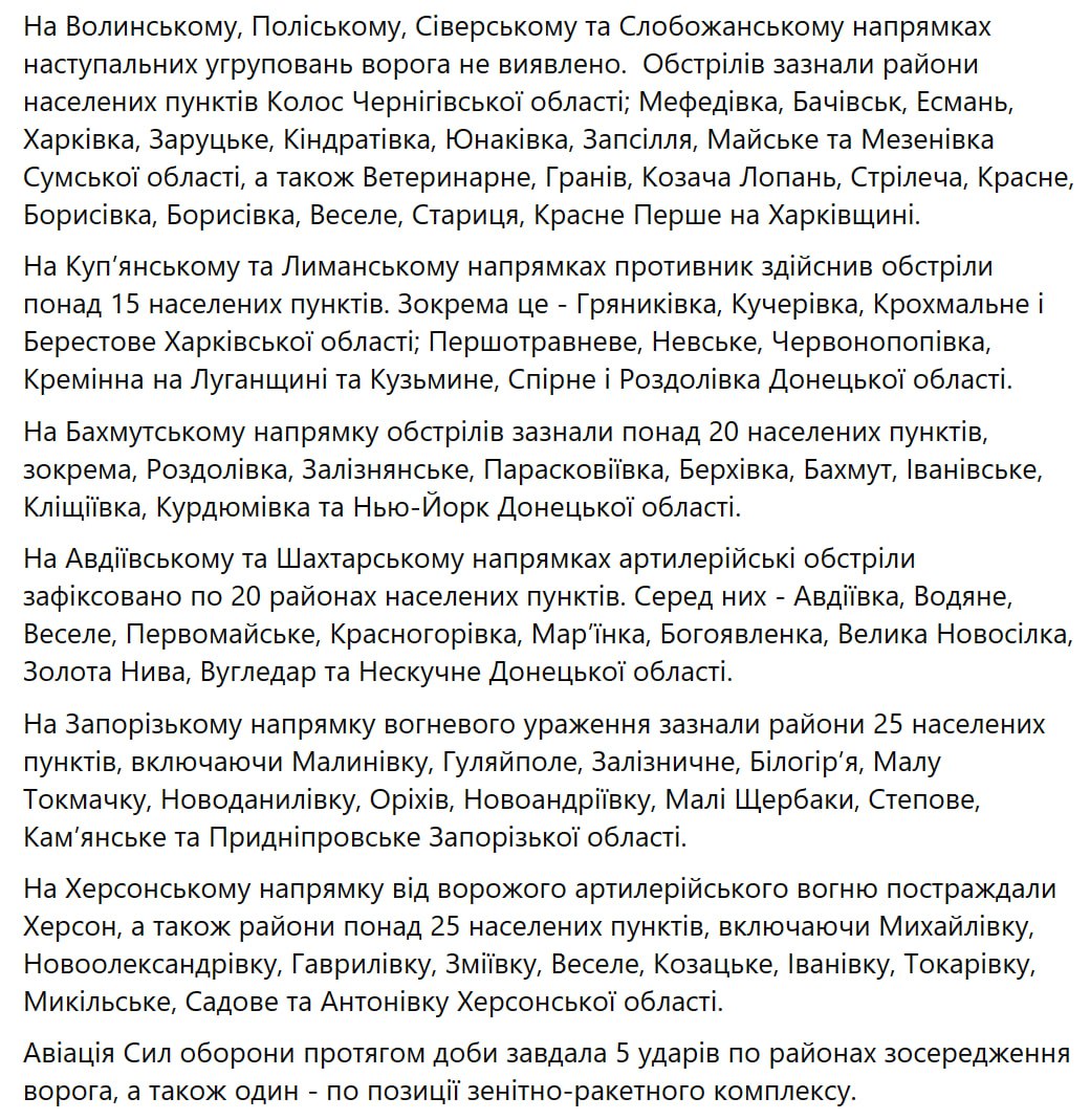 - За минувшие сутки отражены атаки в районах населенных пунктов: Гряниковка и Синьковка Харьковской области; Стельмаховка, Краснопоповка и Кременная в Луганской области; Выемка, Федоровка, Дубово-Васильевка, Раздоловка, Парасковиевка, Берховка, Бахмут, Ивановское, Часов Яр, Веселое, Водяное, Марьинка, Победа, Новомихайловка и Угледар на Донетчине.