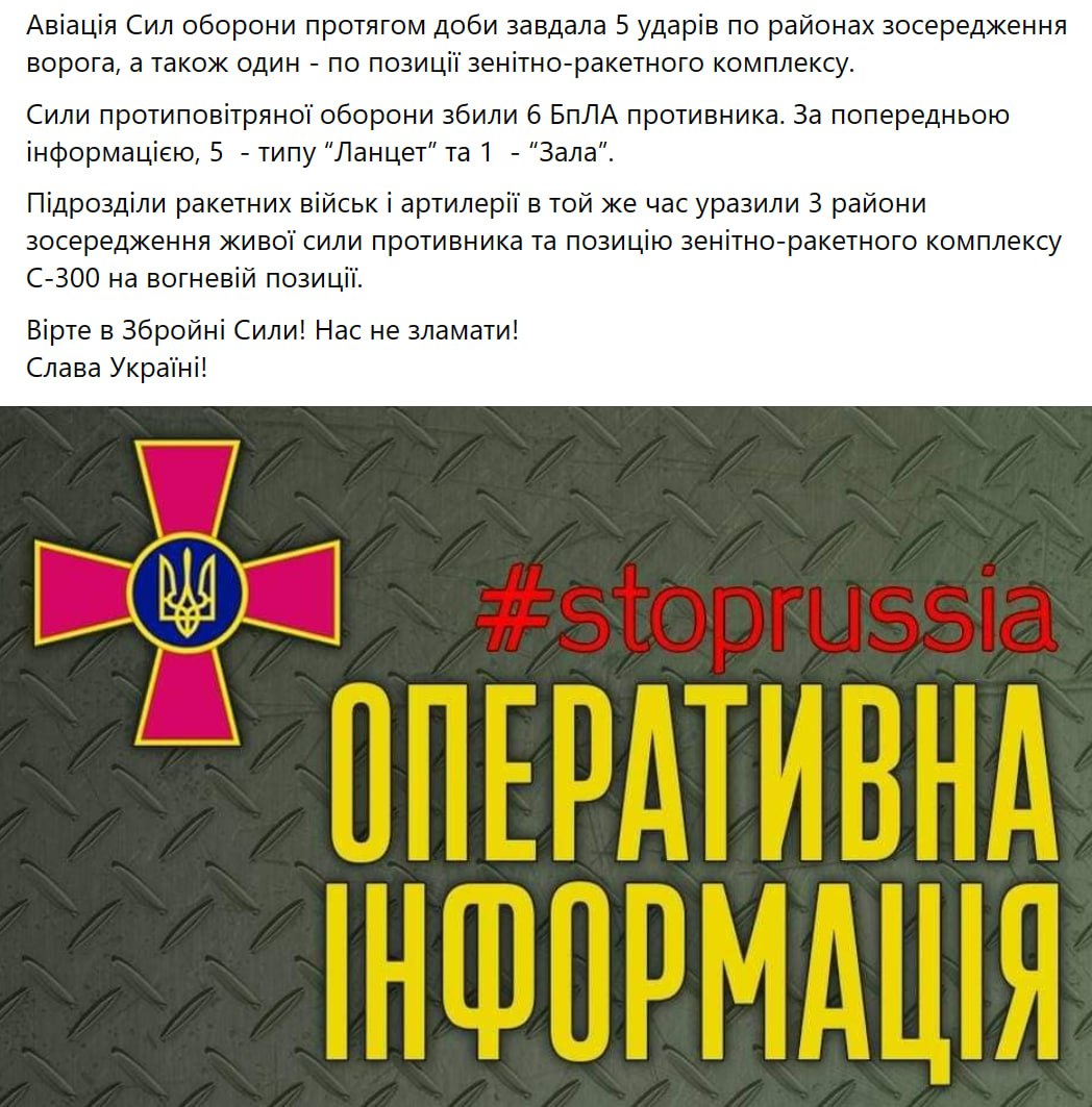 - В течение суток противник нанес 10 ракетных и 29 авиационных ударов (Украина нанесла пять авиаударов). Угроза дальнейших ракетных ударов остается очень высокой по всей территории Украины.