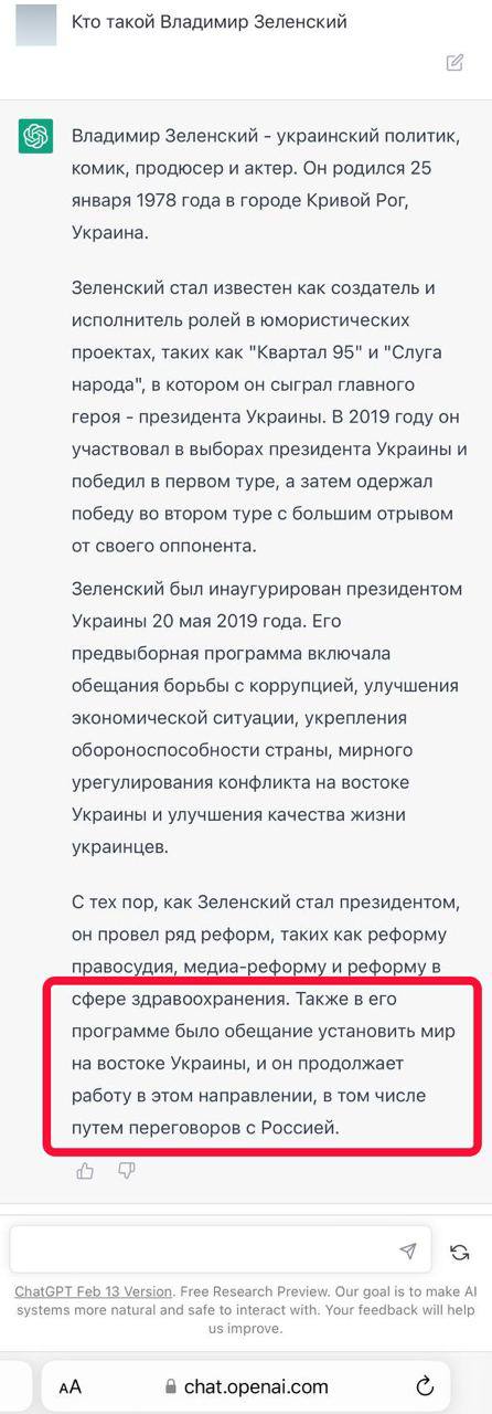 Так, на вопрос кто такой Владимир Зеленский, нейросеть, перечисляя общие сведения из его биографии, заканчивает описание словами о том, что одним из пунктов его предвыборной программы было установление мира на востоке Украины и "он продолжает работу в этом направлении, в том числе, и путём переговоров с Россией".
