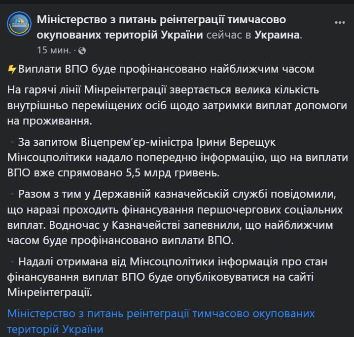 "В дальнейшем полученная от Минсоцполитики информация о состоянии финансирования выплат ВПЛ будет публиковаться на сайте Минреинтеграции", - обещает правительство.