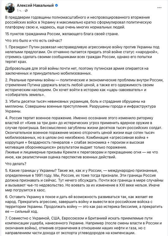 Осужденный российский оппозиционер Алексей Навальный, который год назад призывал россиян выходить на центральные площади городов, чтобы остановить войну, опубликовал в соцсетях свою политическую платформу под названием "15 пунктов гражданина России, желающего блага своей стране".