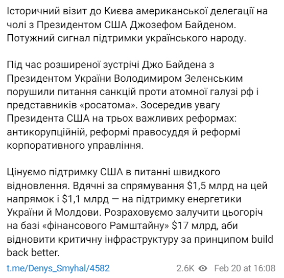 "Ценим поддержку США в вопросе быстрого восстановления. Благодарны за направление $1,5 млрд на это направление и $1,1 млрд - на поддержку энергетики Украины и Молдовы", - написал премьер.
