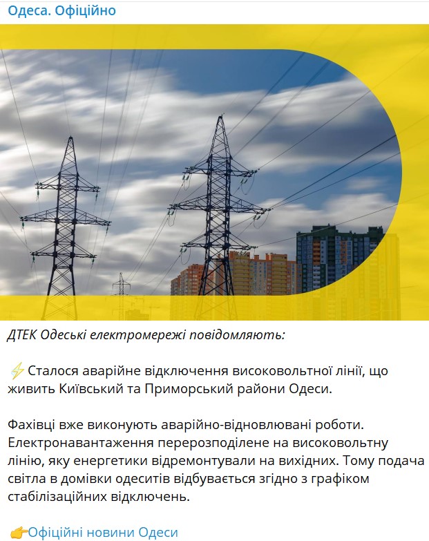 В Одессе действуют графики отключений света. Фото: t.me/odesacityofficial