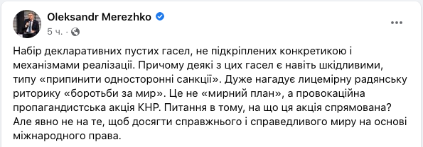 "Причем некоторые из этих лозунгов даже вредны, вроде "прекратить односторонние санкции". Очень напоминает лицемерную советскую риторику "борьбы за мир". Это не мирный план, а провокационная пропагандистская акция КНР. Вопрос в том, на что эта акция направлена? Но явно не на то, чтобы достичь подлинного и справедливого мира на основе международного права", - заявил народный депутат.