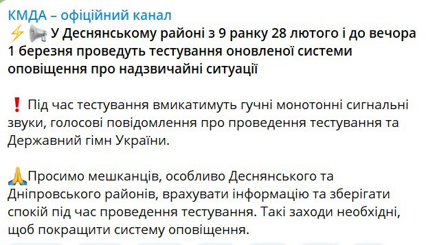 КГГА сообщает о тестировании новой системы оповещения о чрезвычайных ситуациях. Согласно сообщению в телеграм-канале мэрии, в Деснянском районе с 9 утра 28 февраля и до вечера 1 марта проведут тестирование обновленной системы оповещения о чрезвычайных ситуациях.