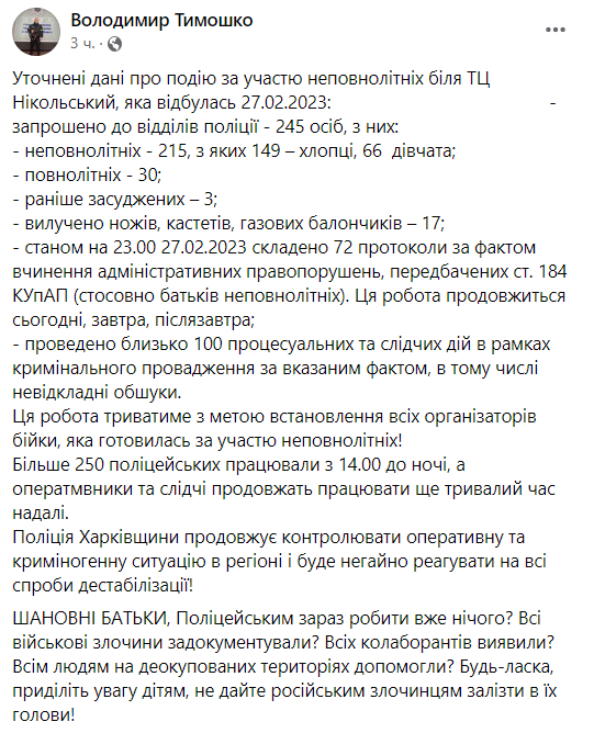 Тимошко также сообщил, что уже было составлено 72 протокола по факту совершения административных правонарушений, предусмотренных ст. 184 КУоАП (касательно родителей несовершеннолетних).