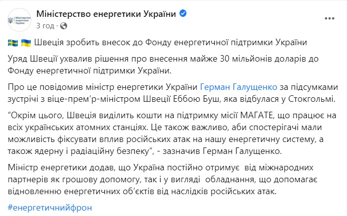 "Кроме этого, Швеция выделит средства на поддержку миссии МАГАТЭ, работающей на всех украинских атомных станциях", - написал он в Фейсбуке.