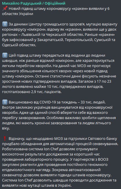"В настоящее время Минздрав не прогнозирует значительного увеличения количества больных из-за нового подвида штамма "омикрон". Последние статистические данные фиксируют незначительный рост новых подтвержденных случаев. В общей сложности с 17 по 23 февраля выявлено почти 10 тыс. подтвержденных случаев, госпитализированы 2,9 тыс. пациентов", - сообщил Радуцкий.