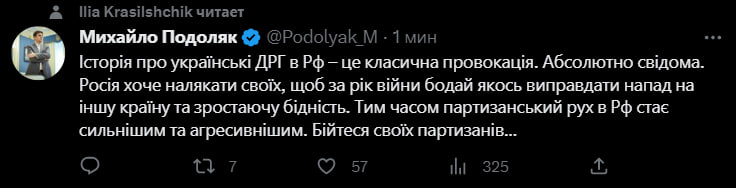 "История с украинской диверсионной группой в РФ - классическая заведомая провокация. РФ хочет напугать свой народ, чтобы оправдать нападение на другую страну и растущую нищету после года войны. Партизанское движение в РФ становится все сильнее и агрессивнее. Бойтесь своих партизан", - написал он.