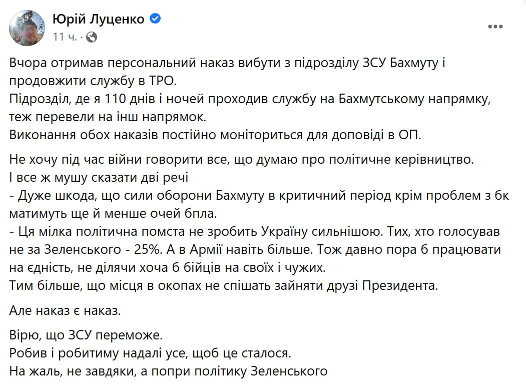 Подразделение, где я служил на направлении Бахмута в течение 110 дней и ночей, также перевели на другое направление. Выполнение обоих приказов постоянно контролируется в OП", - сообщил Луценко.