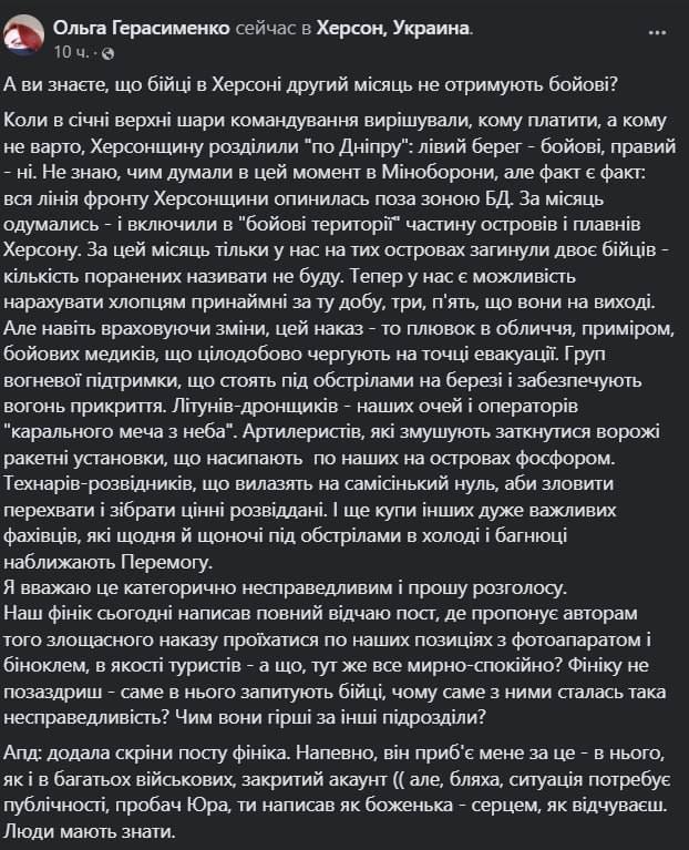 "Когда в январе верхние слои командования решали, кому платить, а кому не стоит, Херсонщину разделили 'по Днепру': левый берег – боевые, правый – нет. Не знаю, чем думали в этот момент в Минобороны, но факт есть факт: вся линия фронта Херсонщины оказалась вне зоны БД. Через месяц одумались – и включили в 'боевые территории' часть островов и плавней Херсона. За этот месяц только у нас на тех островах погибли два бойца - количество раненых называть не буду. Теперь у нас есть возможность начислить ребятам по крайней мере за сутки, три, пять, что они на выходе. Но даже учитывая изменения, этот приказ – это плевок в лицо, к примеру, боевых медиков, круглосуточно дежурящих на точке эвакуации", - пишет Ольга Герасименко.