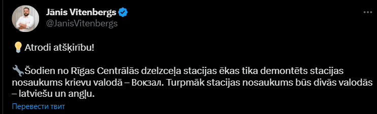 "Сегодня название станции на русском языке - Вокзал - демонтировано со здания Рижского центрального железнодорожного вокзала. Отныне название станции будет на двух языках — латышском и английском", - написал он.