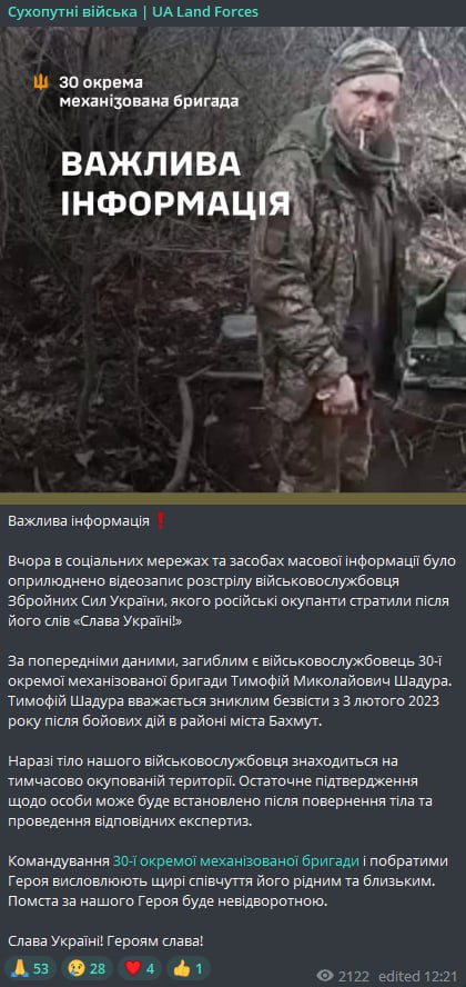 Сухопутные войска назвали имя расстрелянного после фразы "Слава Украине!" солдата. Погибший - Тимофей Шадура, он служил в 30-й отдельной механизированной бригаде и считается пропавшим без вести в районе Бахмута с 3 февраля.