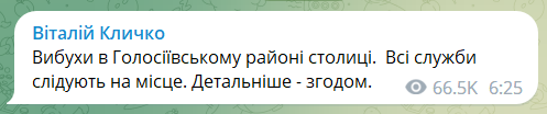 "Взрывы в Голосеевском районе столицы. Все службы следуют на место. Детальнее - позже", - написал он.