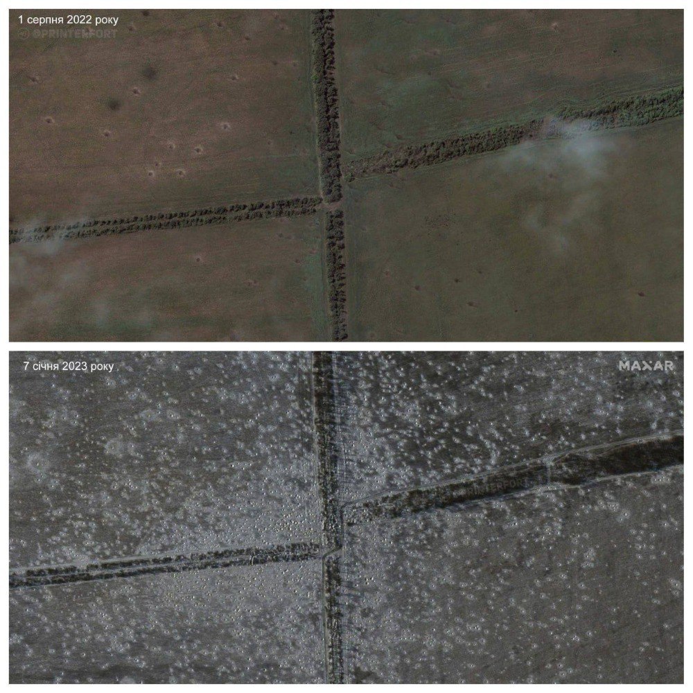 Если на снимках полугодичной давности следов воронок практически нет, то на новых снимках поверхность земли усеяна следами снарядов.