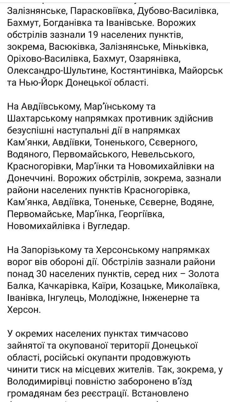 3. На Авдеевском, Марьинском и Шахтерском направлениях - в районах Каменки, Авдеевки, Тоненького, Северного, Водяного, Первомайского, Невельского, Красногоровки, Марьинки и Новомихайловки.