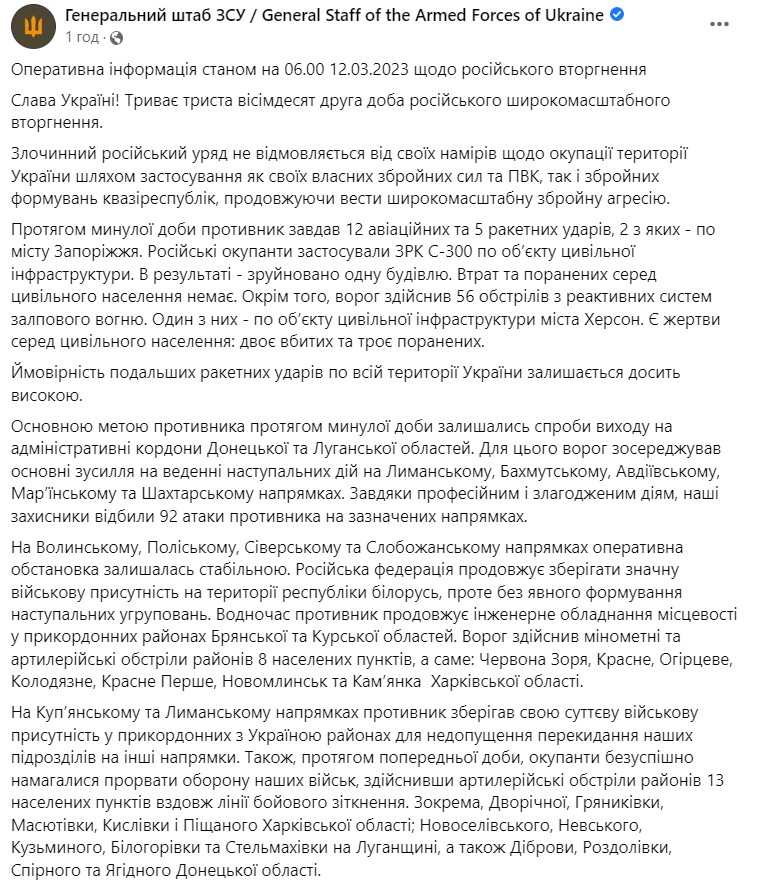 В воскресенье, 12 марта, в Украине идет уже 382-й день войны с РФ.