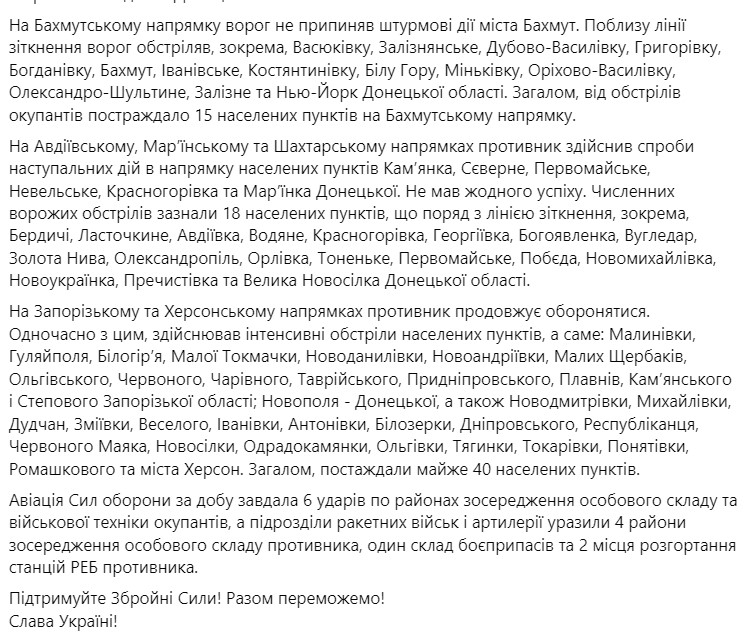 На Бахмутском направлении противник штурмовал Бахмут. Другие населённые пункты в качестве объекта атаки впервые за долгое время в сводке не перечисляются.