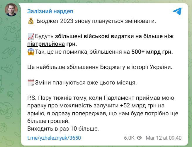 "Бюджет-2023 снова планируется менять. Будут увеличены военные расходы на более чем полтриллиона гривен, - пишет Железняк. Он отмечает, что это самое большое увеличение бюджета в истории Украины и что изменения планируются уже в этом месяце.