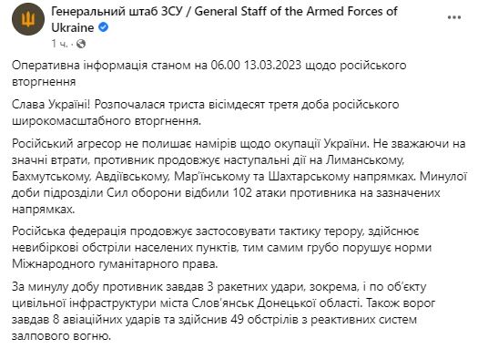 В понедельник, 13 марта, Генштаб ВСУ обнародовал сводку о ситуации на фронте.