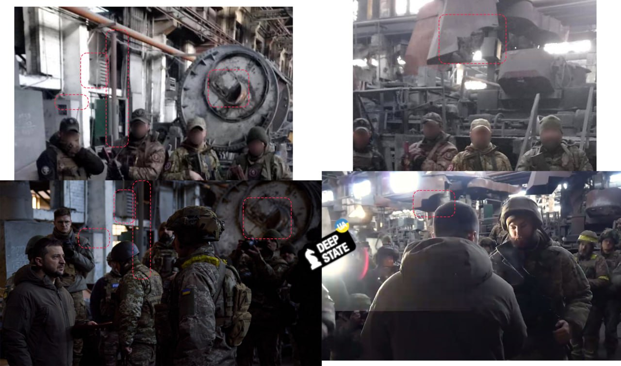 Украинский военный паблик Deep State, комментируя снимки, опубликованные ЧВК, сообщает, что "вагнеровцы" сфотографировались в том же цеху, где 20 декабря награждал украинских военных Владимир Зеленский.