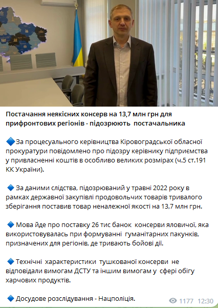 По данным следствия, подозреваемый в мае 2022 года в рамках государственной закупки продовольственных товаров длительного хранения поставил товар ненадлежащего качества на 13,7 млн грн.