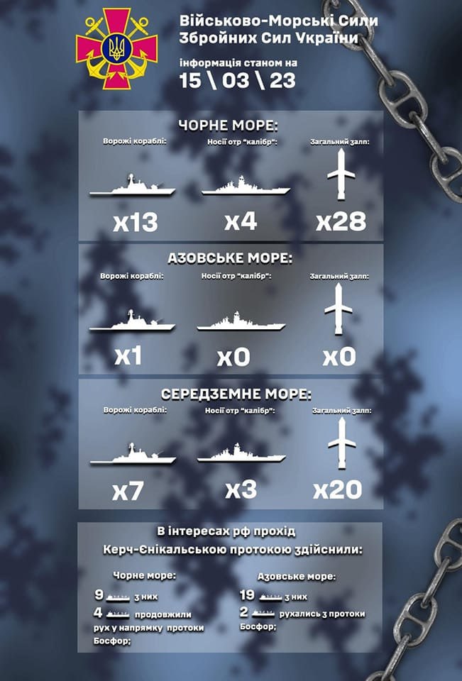 По состоянию на 15 марта в Черном и Азовском морях находятся 14 военных кораблей РФ.