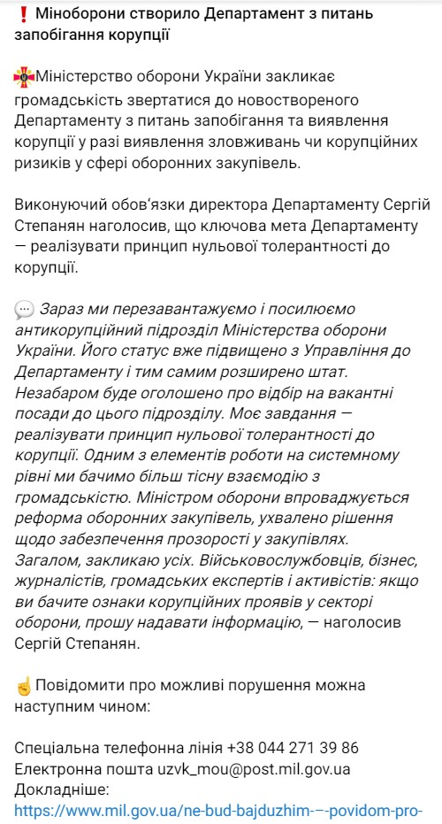 Исполняющий обязанности директора департамента Сергей Степанян призвал "военнослужащих, бизнес, журналистов, общественных экспертов и активистов" сообщать, если увидите, про "признаки коррупционных проявлений в секторе обороны".