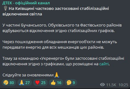 "В части Бучанского, Обуховского и Фастовского районов происходят отключения согласно стабилизационным графикам. Из-за повреждения оборудования энергообъекты не могут передавать энергию всем жителям этих районов. Поэтому по команде "Укрэнерго" были применены стабилизационные отключения согласно графикам, размещенным на сайте", - говорится в сообщении.