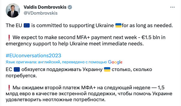 "ЕС стремится поддерживать Украину столько, сколько потребуется. Мы ожидаем, что на следующей неделе осуществим второй платеж MFA+ - 1,5 миллиарда евро экстренной поддержки, чтобы помочь Украине удовлетворить неотложные нужды”, - написал он в Твиттере.