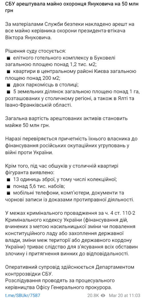 СБУ арестовала имущество охранника экс-президента Украины Виктора Януковича на 50 миллионов гривен.