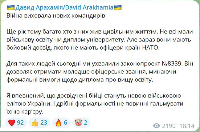 "Война воспитала новых командиров. Еще год назад многие из них жили гражданской жизнью. Не все имели военное образование или диплом университета. Но сейчас у них есть боевой опыт, которого не имеют офицеры стран НАТО. Для таких людей сегодня мы приняли законопроект №8339. Он позволяет получить младшее офицерское звание, минуя формальные требования по диплому о высшем образовании", - пишет Арахамия.